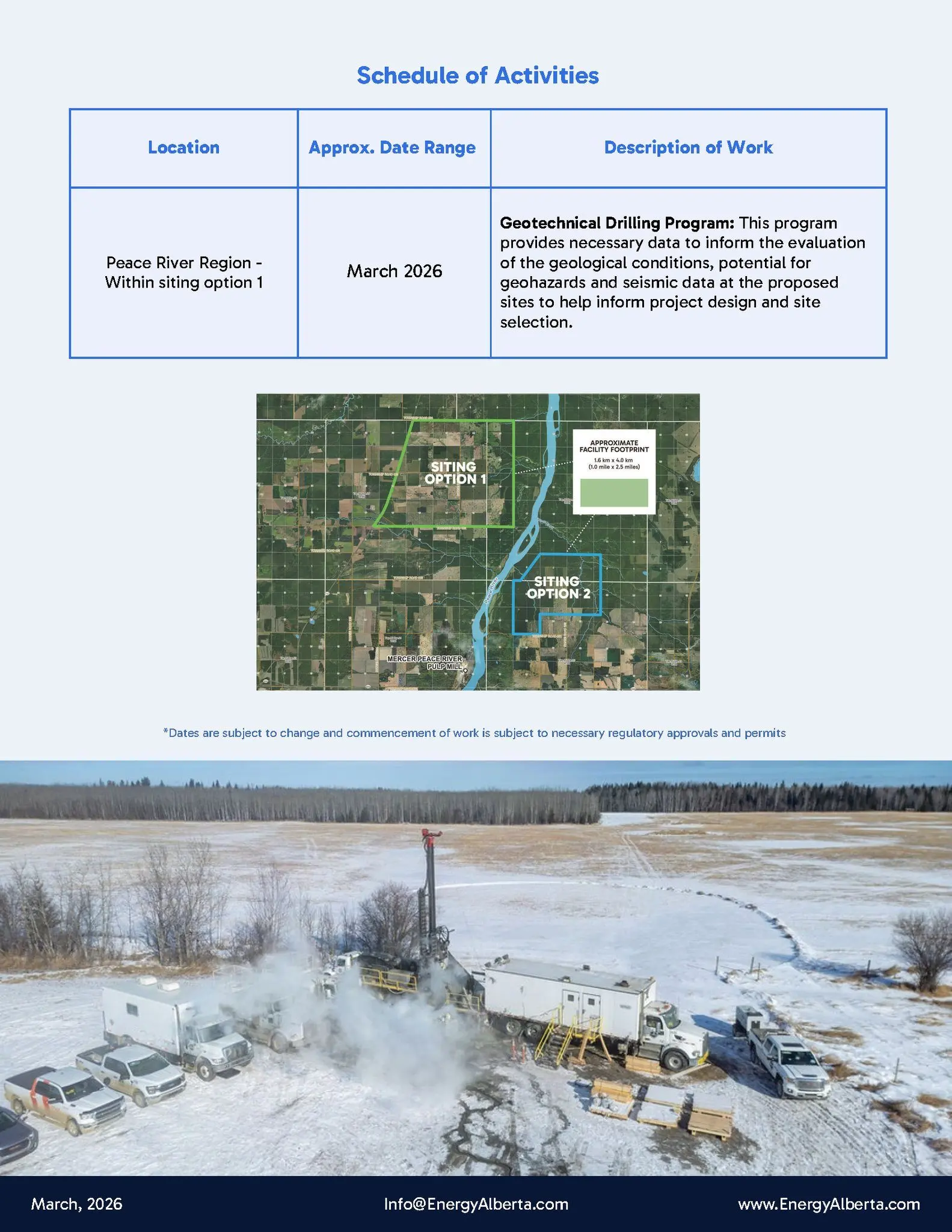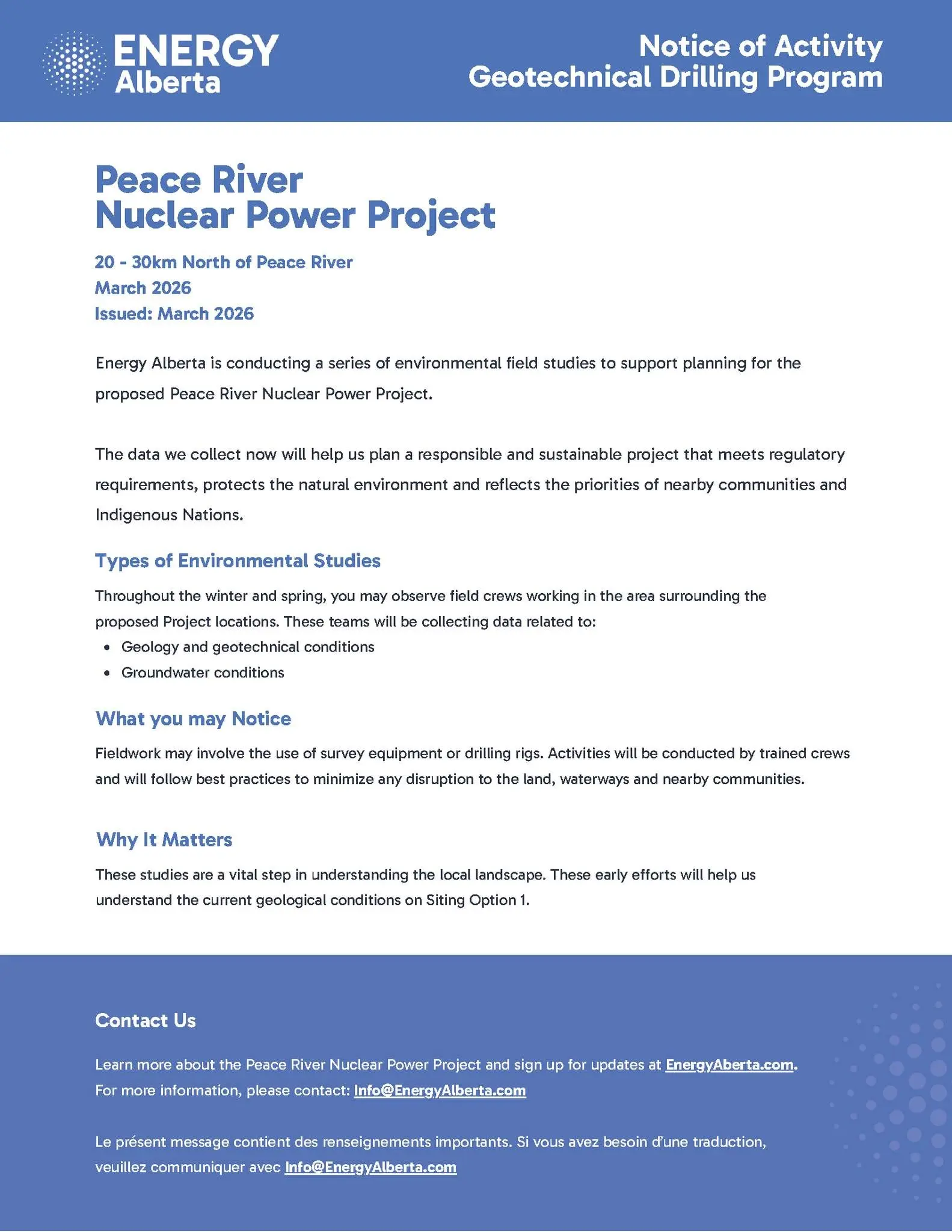 The company says the work will follow industry best practices to minimize disruption to the land, waterways, and nearby communities. Questions about the project or the geotechnical drilling program can be directed to info@energyalberta.com.